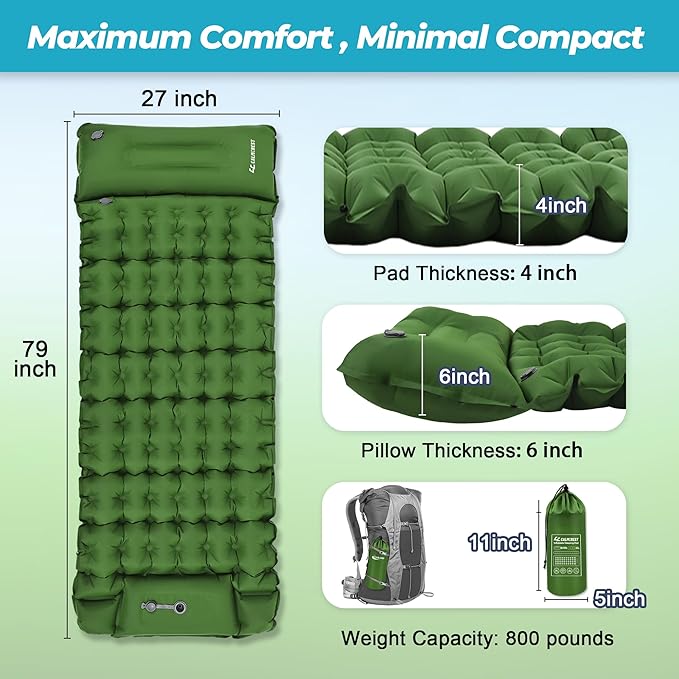 Sleeping Pad for Camping, 4in Thickness Inflatable Sleeping Mat with Adjustable Pillow & Built-in Foot Pump,Lightweight Camping Air Mattress with Waterproof Nylon for Hiking,Traveling-Green