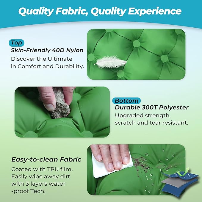 - Durable & Weather-Resistant: Crafted from high-quality 40D nylon with a TPU coating, the CALMCREST inflatable camping mattress is tear-resistant, waterproof, and built to last. With an R-value of 3.0, it provides effective insulation, shielding you from ground cold and suitable for environments above 32°F. Its durable design withstands various terrains, from rocky trails to sandy beaches