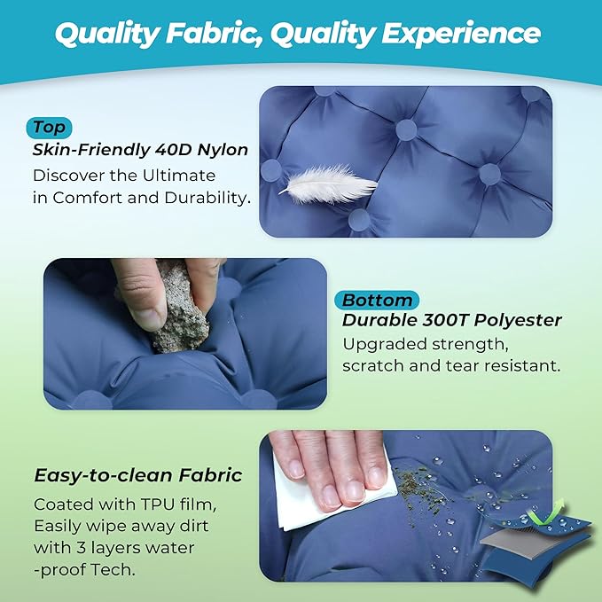 - 【Durable TPU Coated Nylon】This inflatable camping mattress is made from high-quality 40D nylon with a composite TPU coating, offering tear resistance and waterproof properties. The extra-thick and durable TPU coating is suitable for various terrains such as rocks, beaches, grasslands, etc..