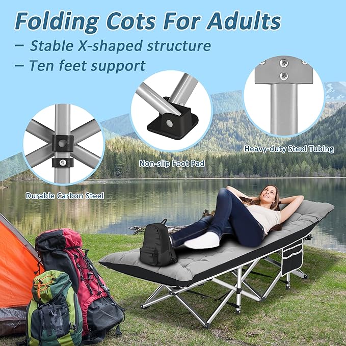 - Heavy Duty Camping Cot: HABUTWAY camping cot is made of high-quality carbon steel. The X-shaped structural frame and 10 non-slip support legs ensure the stability of the camp cot. 600 LBS weight capacity, it's sturdy enough to hold the weight of most adults, an ideal sleeping cot for adults.