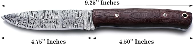 - 🗡:KNIFE DIMENSIONS: It is best as a Hunting, Survival, Camping, Skinning and Tracking Knife a complete Package of an Outdoor Adventures. 9.25 inch Total Length, 4.75 inches Blade and 4.5 inches Handle.