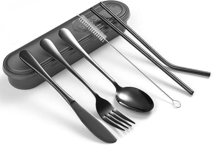 - 7-Piece Reusable Utensils with Case:includes 1 x dinner knife,1 x dinner fork, 1 x dinner spoon, 1 x dinner Straight straw,1 x dinner Bended Straw ,1 x Special brush for straw,1plus travel flatware carrying case,suitable for restaurant, travel, camp, school or workplace...