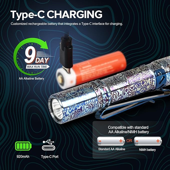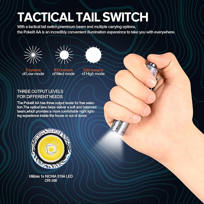 - High Performance Flashlight:Pokelit AA Titanium pocket flashlight emits bright light up to 500 high lumens. Featured with 3 light modes: High / Medium / Low (Without memory function), running time up to 58 hours,perfectly meet the various needs of daily use, Pokelit AA will be your perfect companion.