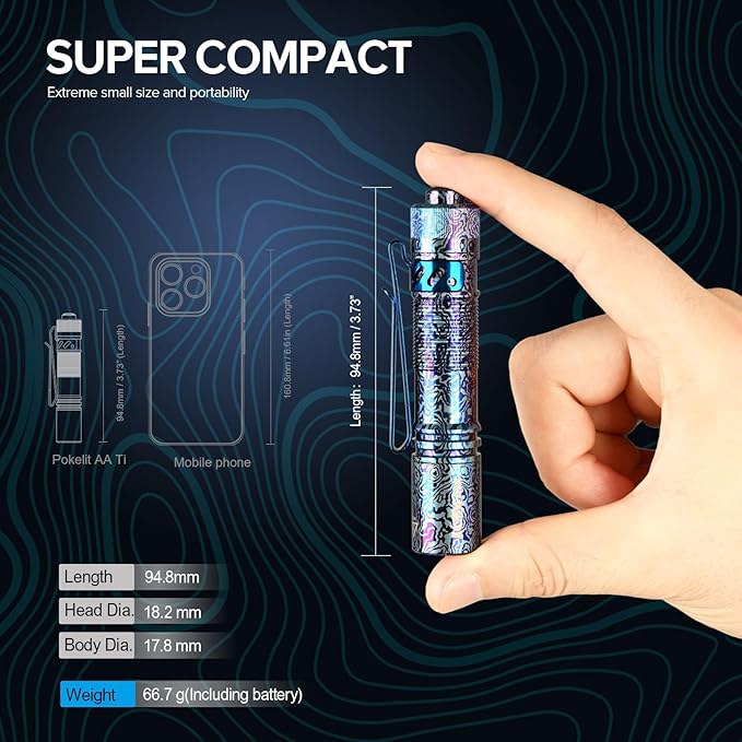 - Sturdy Flashlight: The Pokelit AA Titanium edc flashlight combining a precious metal titanium with a unique design and distinct markings will certainly make your gear stand out. Its IP68 water resistance and 1.5 meters impact resistance make the small flashlight endure rough handling and harsh weather.