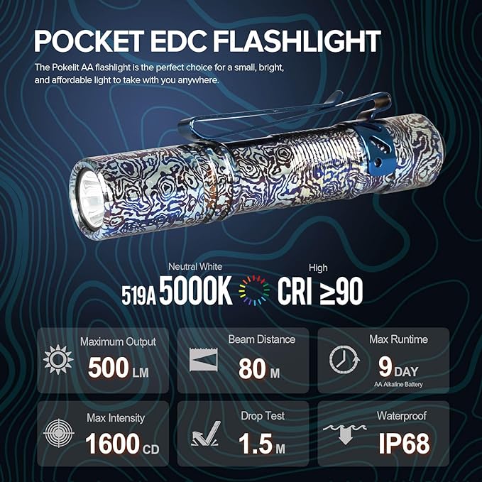 - High CRI Flashlight: Pokelit AA Titanium edc flashlight Adopted 519A LED high CRI value 90 and a neutral white 5000K color temperature, it will be maximum restore the original color of the object, you will be easier to observe the object.