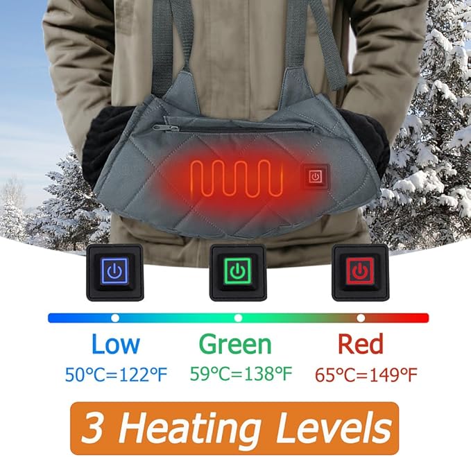 - 【3 Temperature Control】 The heated hand muff with pockets has 3 adjustable heat settings Red - High: 65℃/149℉; Green - Medium: 59℃/138℉; Blue - Low: 50℃/122℉. Press and hold the button for 2-3 seconds to display the red light to start heating, depending on the ambient temperature, you can easily switch between the 3 heat settings.【NO POWER BANK】