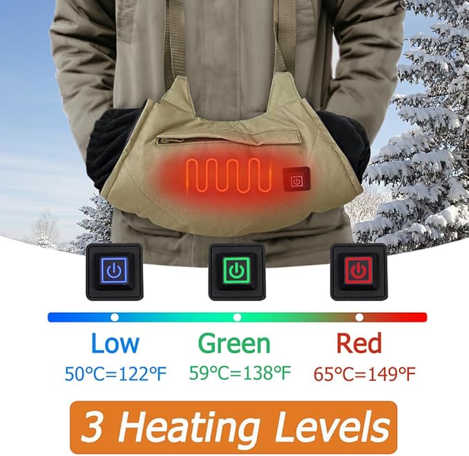 - 【3 Temperature Control】 The heated hand muff with pockets has 3 adjustable heat settings Red - High: 65℃/149℉; Green - Medium: 59℃/138℉; Blue - Low: 50℃/122℉. Press and hold the button for 2-3 seconds to display the red light to start heating, depending on the ambient temperature, you can easily switch between the 3 heat settings.【NO POWER BANK】