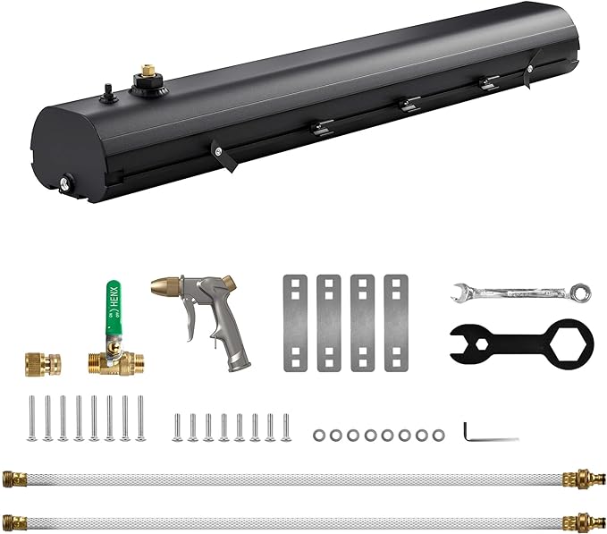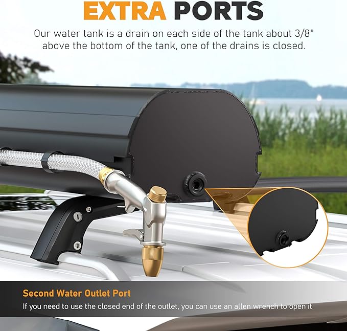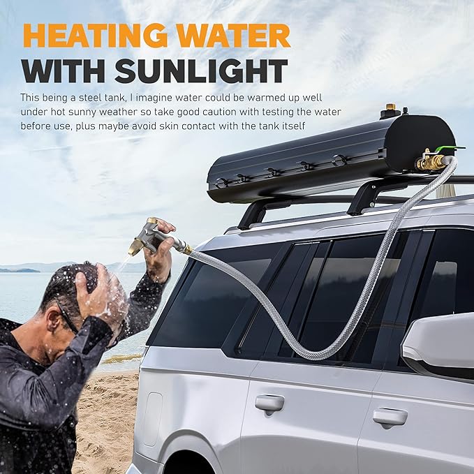 - Superior Material: Our pressurized water tank is made from all aluminum so it's not going to buckle or warp in the sun. Road camping shower water tank use black coating with durable. Its mat black absorbs heat, even cold water gets hot after just a couple hours in moderate sun. so take good caution with testing the water before use, plus maybe avoid skin contact with the tank itself.