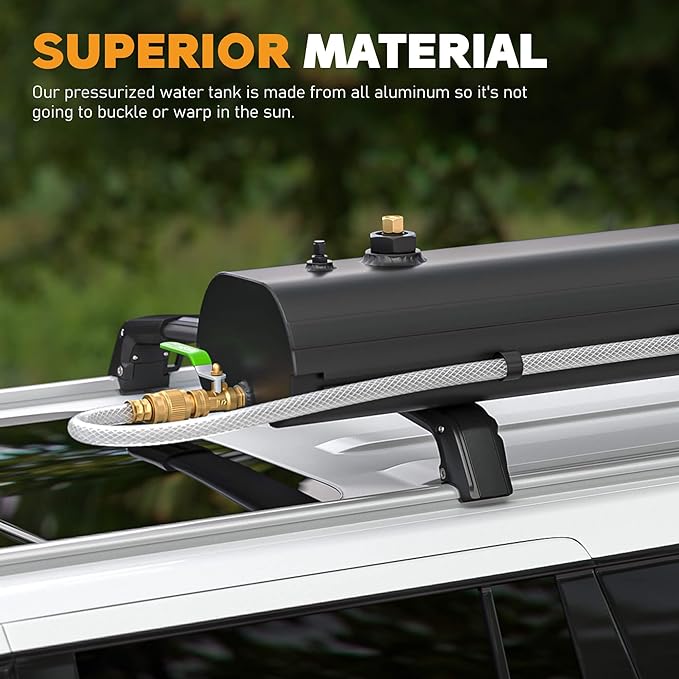 - Attention: The pressurized water tank delivers 8 gallons (30L), you will need a roof rack that holds 8 gallons (about 67 pounds) plus 30 pounds for a maximum safe weight of 100 pounds (and that's just the static weight) before buying. Easily pressurize the tank using a common tire pump/inflater (Not included).