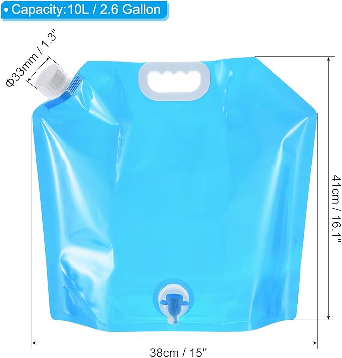 - Color: Blue; Material: PE; Capacity: 10L / 2.6 Gallon; Size: 41 x 38cm / 16.1" x 15" (L*W); Packing List: 3 x Water Container Bag