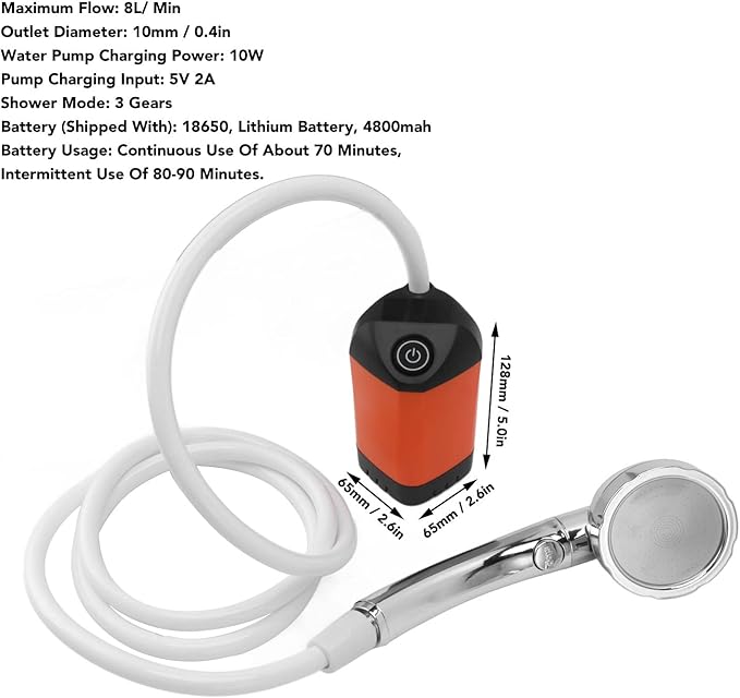 - 4800mAh Battery: This camping shower has built in 4800mAh lithium battery, which provides long continuous working. You can it through your charger or charging bank, convenient and fast.
