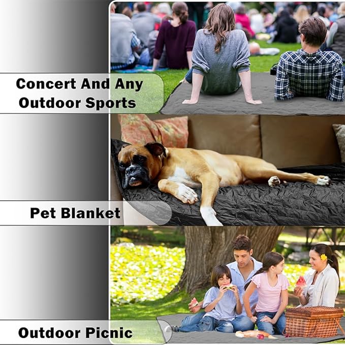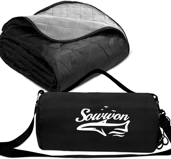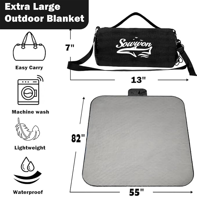 Waterproof Outdoor Blanket 82”X 55” Packable, Stadium Blankets for Camping with Quilted Fleece Lining, Large Windproof Emergency Throw Mat for Garss Picnic Hiking Road Trip, Machine Washable, Black