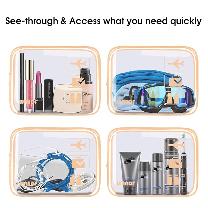 - TSA APPROVED --- Made of clear PVC fabric, the WANDF toiletry bag strictly adheres to TSA 3-1-1 liquids rules for carry-on bags on all airlines. This makeup bag measures 7.7 x 5.9 x 2.8 inches, which is large enough to hold 100ml liquid bottles. It helps individuals spot items without rummaging through the bag. You cannot imagine how quickly and easily this clear shower bag can help you pass through security screening or find the items you need!