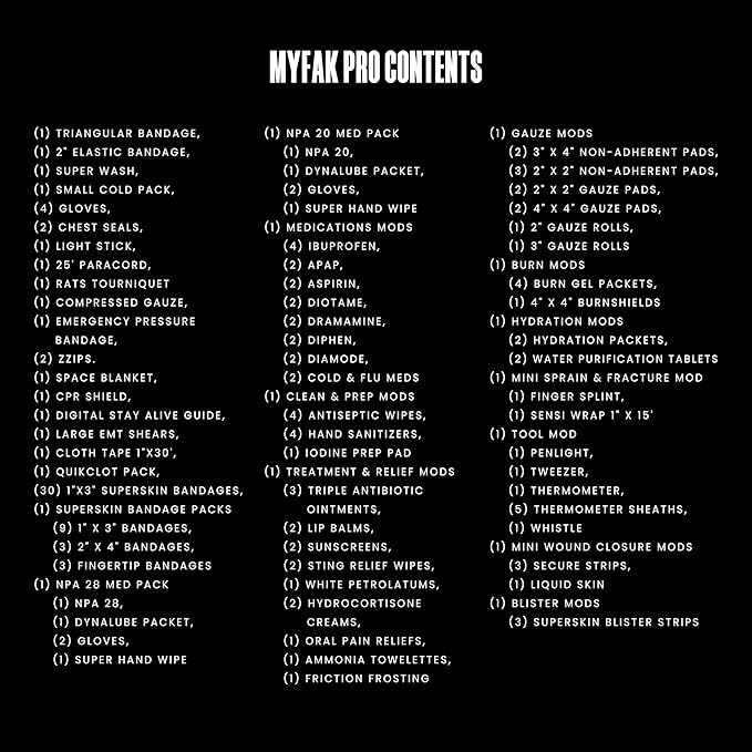 - Comprehensive 140 Item PRO Ifak Kit: The MyFAK pro is a comprehensive and compact first aid kit designed to provide you with everything you need to save a life. Equipped with a tourniquet, emergency pressue bandage, compressed gauze and more. See video for full details.