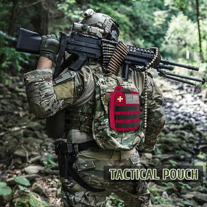 - 【Compatible and Portable】 The military grade MOLLE medical pouch is made of 1000D nylon, which is lightweight and waterproof. Inside the bag, there are three large compartments and several straps, all survival gear and equipment are stored in an organized and easy-to-find manner, making it easy to locate necessary items in an emergency situation. The MOLLE system on the back also allows you to easily attach the kit to your tactical vest, backpack, or belt.