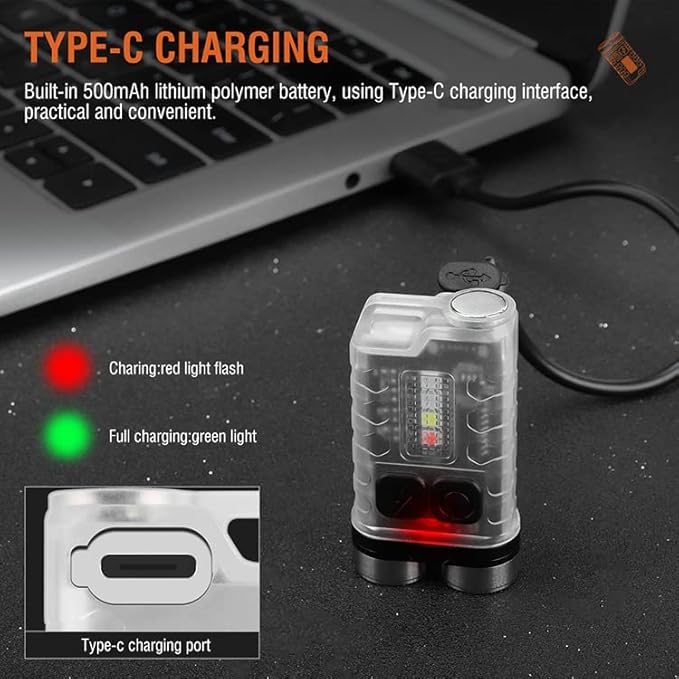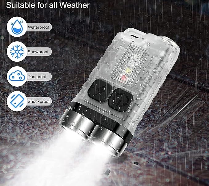 - 👌 Easy to Use - The main light of our mini flashlight has 4 different brightness modes. Double-click to turn on the main light, and click to switch the light mode: high light - medium light - Low light - Energy saving mode - long press off. Long press the side light to turn it on, and release to turn off. Double-click to turn on the side light, click to switch purple light/Red light/red flash/Red blue flash, and long press to turn off.