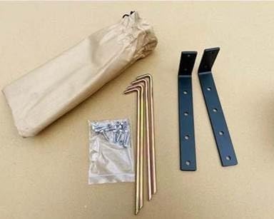 - Includes interior mesh pocket, velcro strap hose and shower head holder, metal mounting brackets, and metal anchor stakes