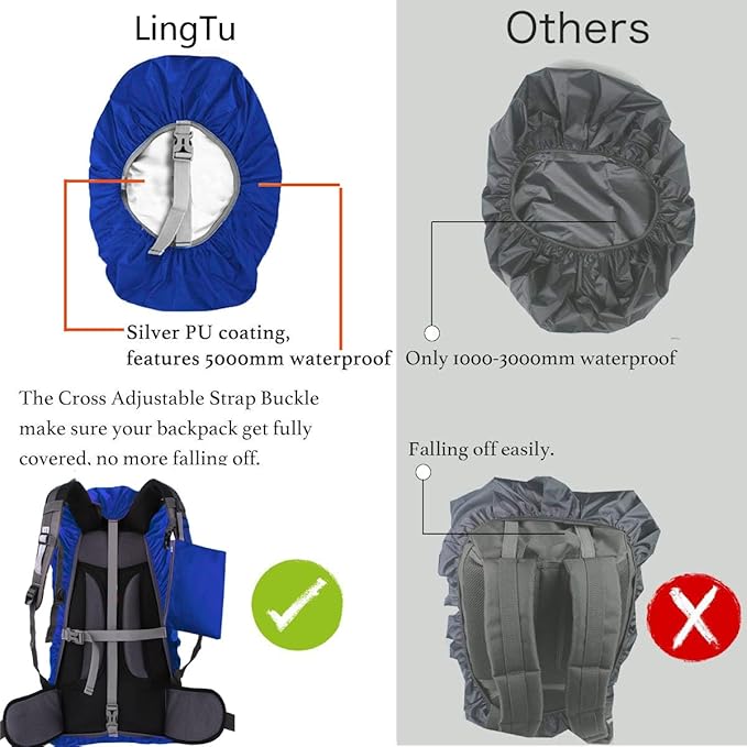 • - UPGRADED BUCKLE STRAP: Equipped with an upgraded buckle strap, this rain cover securely attaches to your backpack, preventing it from slipping or getting loose during your outdoor adventures.