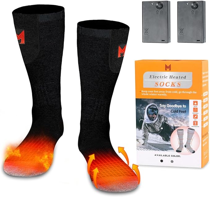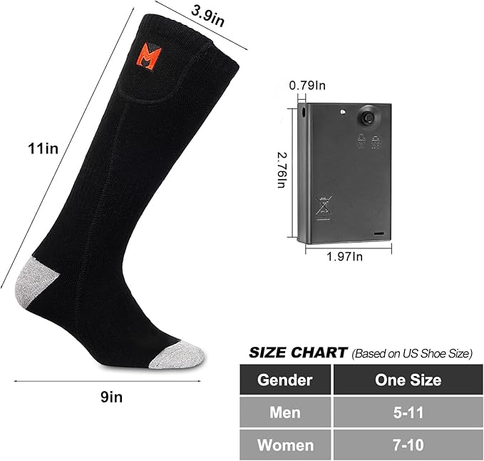 - 【Necessary for Winter】: With the electric heating socks, you can enjoy your fishing, camping, snowboarding, hunting, hiking, skiing, snowboard, and outdoor work, etc. The winter battery socks is a considerate gift for your parents, friends and family. Fits for men 5-11, women 7-10.