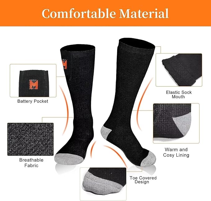 - 【Safety and Protect Your Feet】: Heating elements of the battery heated socks made of insulated material, no worries about heating safty. Comfortable heating temprature lets your feet no longer be cold and stiff in the cold winter.