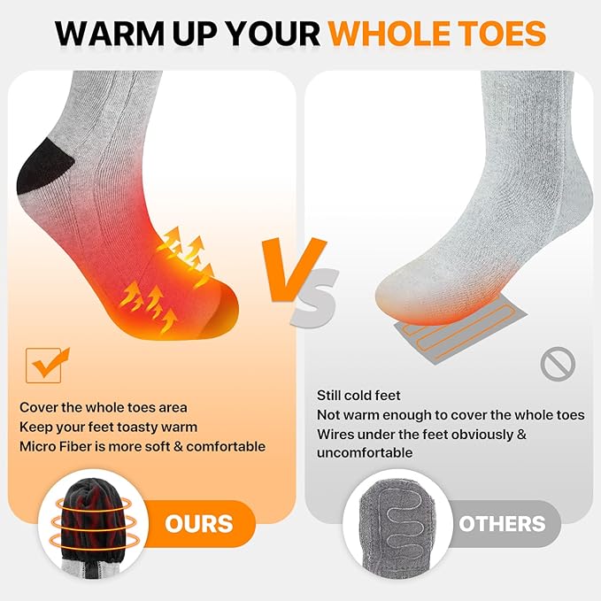 - 【Warm Up Whole Toes in 30s】Rechargeable heated socks rapidly heat up within 30s, cover the back of the feet and the whole toe area, and spread throughout the whole foot, keeping your feet warm and cozy.