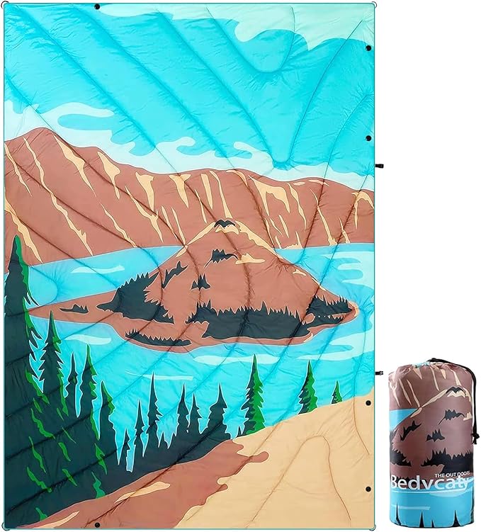Camping Blanket, Puffy Waterproof Travel Blanket, Picnic Blanket, for Outdoors, Travel. (Lake, 69"x 53")