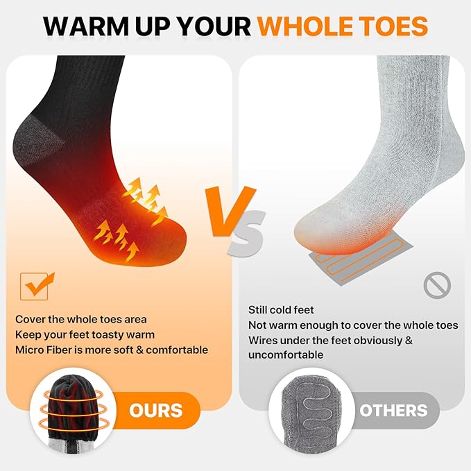 - 【Warm Up Whole Toes in 30s】Rechargeable heated socks rapidly heat up within 30s, cover the back of the feet and the whole toe area, and spread throughout the whole foot, keeping your feet warm and cozy.