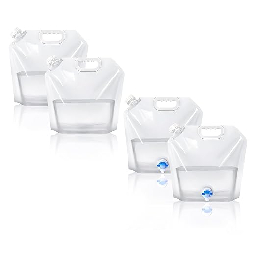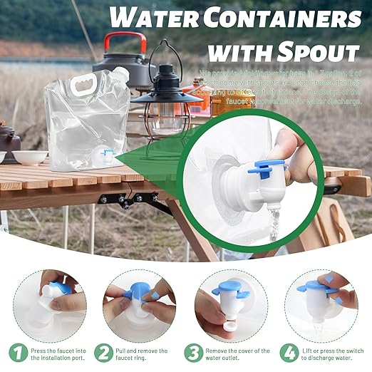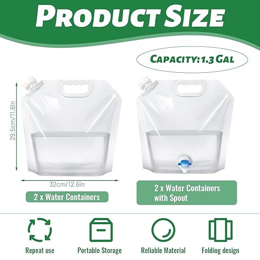 - 【Meet Your Different Needs】 We provide 4 folding water bags in 1.3 gallon, 2 of which come with spouts. You can choose the bag according to different situations. The design of the faucet is convenient for water discharge.