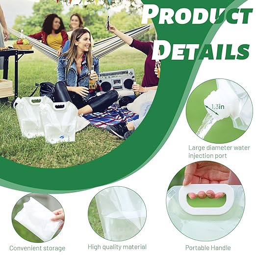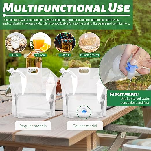 - 【Multifunctional Use】Use camping water container as water bags for outdoor camping, barbecue, car travel, and survival & emergency kit. It is also applicable for storing grains like beans and corn kernels.