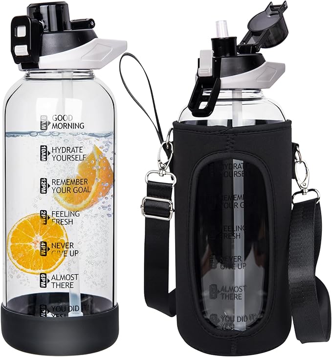 - TIME MARKER & WIDE OPENING - Time markers and motivational quotes on the glass water bottle remind you to drink water and help boost your daily water intake. With wide-mouth design, the drinking bottle is great for fruit infused water, juice, milk, coffee and smoothies.