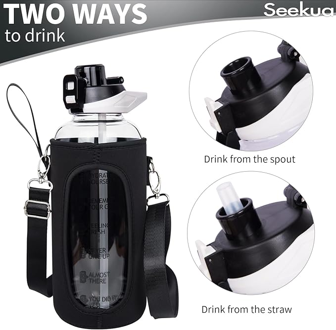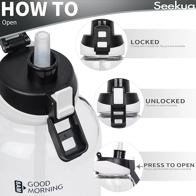 - FLIP LID & STRAW - Leakproof flip top lid. Simply open the glass bottle with one hand by clicking the button. There're two ways to drink. You can either directly sip from the straw or take off the straw and drink from the spout.