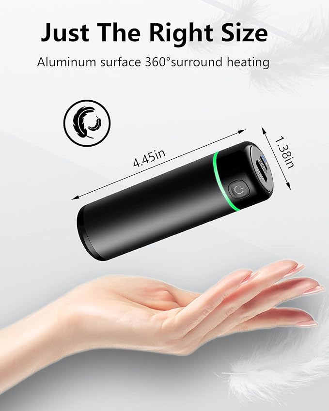 - 【Lightweight & Portable】Length: 4.44in/11.3cm , Width: 1.38in/3.5cm , Weight only: 0.27lb/125g.The shell of hand warmer is made of aluminum alloy, which conducts heat quickly and has no peculiar smell, and the frosted design is more comfortable to hold. Small well-constructed body makes it lightweight, easy to grasp, and slip into gloves or pocket.