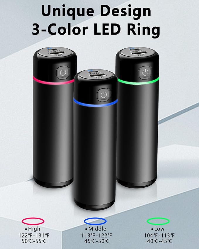 - 【3 colour LED Ring Design More visual】3 colours ring for 3 heating levels.Green LED ring:Low temperature: 104-113℉ (40-45℃) for a 5-7h working time.Blue LED ring: Medium temperature 113-122℉ (45-50℃) for a 3-5h working time, and Red Led ring: high temperature: 122-131℉ (50-55℃) for 3-4 hours.