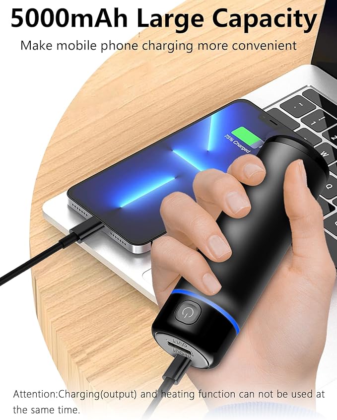 - 【10000mAh Rechargeable Power Bank】Built-in 2 pack 5000mAh polymer lithium-ion batteries, the handwarmer can be fully charged in just 3 hours. As a power bank, it can fully charge electronic devices like mobile phone with the provided USB-C charging cable(output:5V/2A ). Type-c also have output function more wider applicability. No worry about cellphone’s battery dying when you are out. Note: When heating function is on, the hand warmer cannot charge other devices.