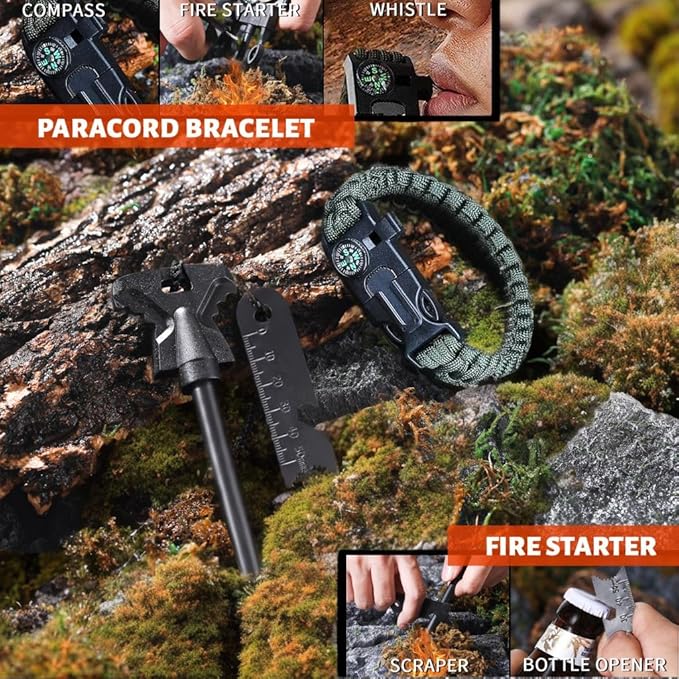- 【READY-TO-USE & DURABLE】:Not only is this gear easy to carry and lightweight, but it's also comprehensive, No need for professional training, it's simple to use and perfect for impromptu trips: Fire Stone Starter, Tactical Pen, Flashlight, Multifunctional Spoon, Emergency Blanket, Outdoor rope, Light Sticks, Parachute Cord, Survival Bracelet, Ba1t, Waterproof Box...