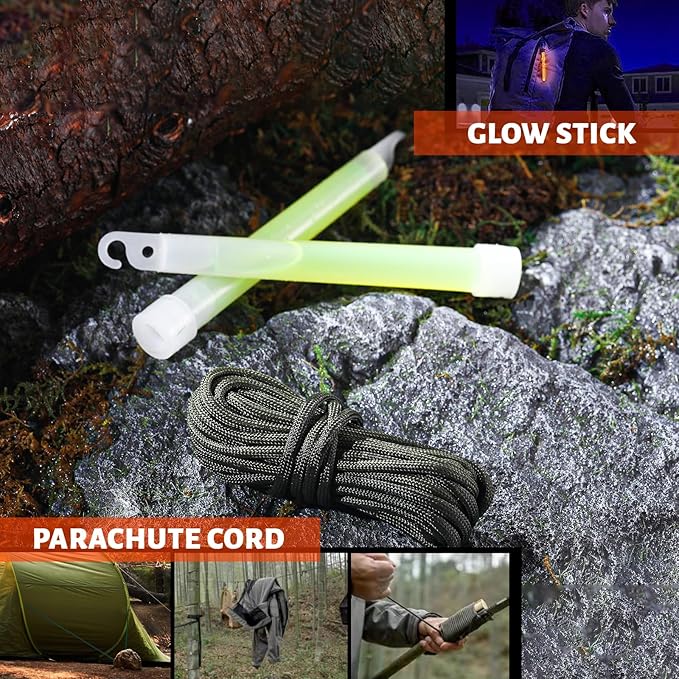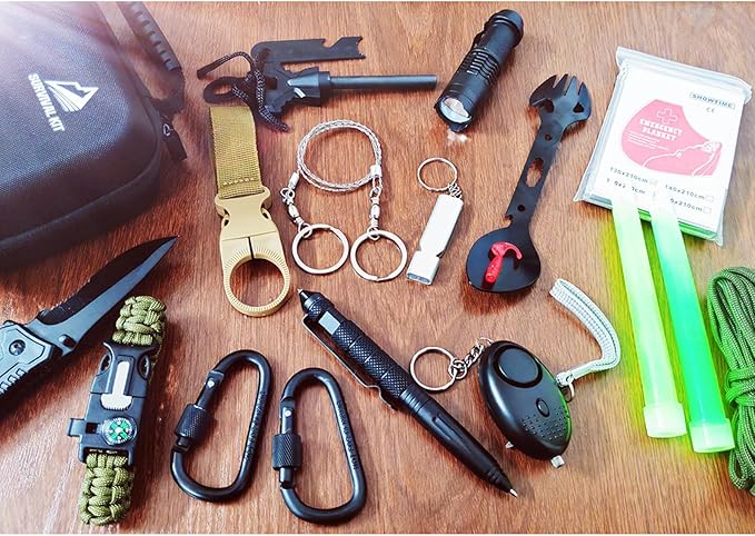 - Included Components : Fire Stone Starter, Tactical Pen, Flashlight, Multifunctional Spoon, Emergency Blanket, Outdoor rope, Light Sticks, Parachute Cord, Survival Bracelet, Ba1t, Waterproof Box... Fire Stone Starter, Tactical Pen, Flashlight, Multifunctional Spoon, Emergency Blanket, Outdoor rope, Light Sticks, Parachute Cord, Survival Bracelet, Ba1t, Waterproof Box...