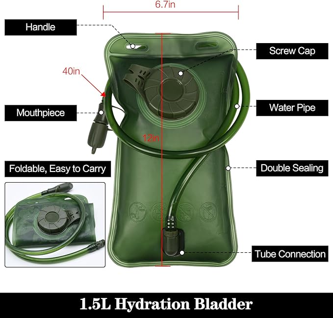 - 【1.5L Hydration Bladders】- You will get 1pcs blue hydration bladder, 1pcs army green hydration bladder and 2pcs suction pipe. 1.5L water bladder can contain water at -4°F to 122°F. Pipes (4in diameter, 40in length) provide a wholesome flow for easy drinking and keep you hydrated when hiking, climbing or running, etc.