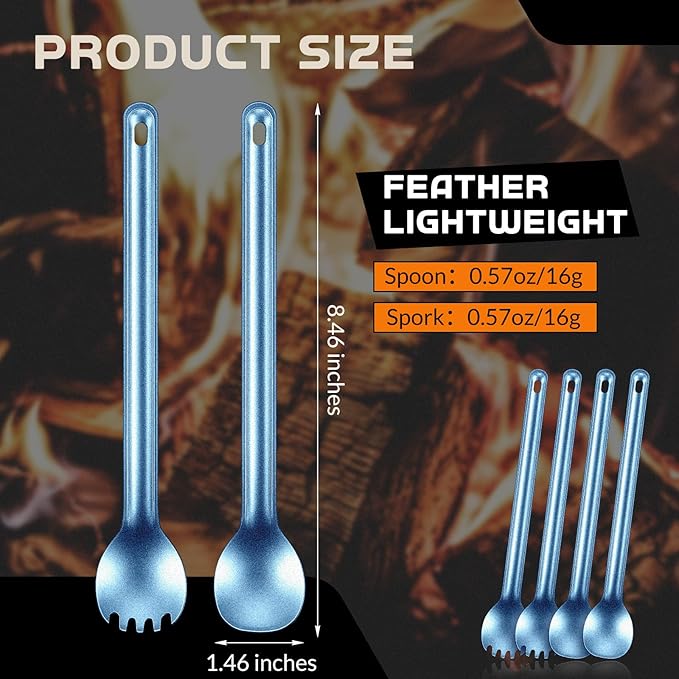 - Portable Size: camping spork and spoon are about 8.46 x 1.46 inches/ 21.5 x 3.7 cm, only 0.57 oz/ 16 g for each, compact, easy to carry and store, not occupying space, so you can effortlessly put the set into your backpack and take for outdoor activities