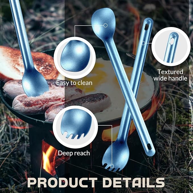- Long Handle Design: long handled spoon and spork are comfortable and handy to hold, convenient for eating food in deep cooking pots, to easily reach the bottom of the pots, reducing waste, also avoiding your hands being scratched or getting dirty during eating