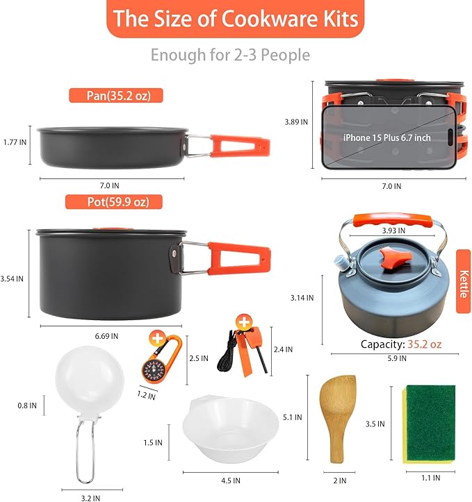 - The Best Money You Ever Spent - the 12pcs Camping Cookware Set Is Perfect for 1-2 People. Package Includes: 1*59.9oz Camping Pot with Lid (6.69*3.54 Inch),1*35.2oz Frying Pan(7*1.77 Inch),1*35.2oz Camping Kettle with Lid,3 Plastic Bowls ,1 Plastic Soup Spoon,1 Banboo Spatula,1 Cleaning Sponge,1x Net Bag for Storage, 1 Flient(3 colors randomly), 1 Mountainerring Buckle Compass(7 colors randomly).