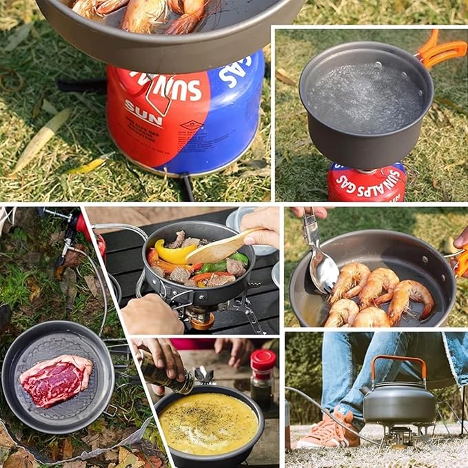 - The Best Camping Kitchen Set - Our Camping Cooking Set Is the Ideal Choice for Outdoor Activities. It Includes a Comprehensive Set of Cooking Tools, Such As Pots, Pans, Kettles, Multiple Transparent Bowls, Collapsible Soup Spoons, Rice Spatulas, and Cleaning Sponges. This Set Is Not Only Suitable for Boiling Water and Cooking But Also Perfect for Enjoying Delicious Camping Meals, and Handcrafted Coffee. So It's the Camping Gear Must Haves and Also for Rv Camping Must Haves.