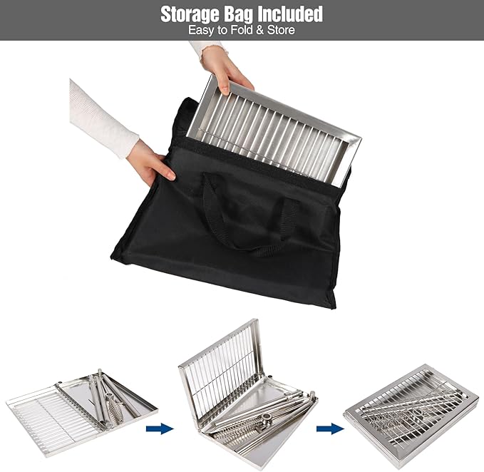 - Foldable Design: The open size of the BBQ steel grate is 16.7x12x33.4''/42.6x31x85cm. The folded size is 12x8.4x1.5''/31x21.3x4cm. The weight is 6.6lbs/3kg. It’s portable and lightweight, easy to carry with storage bag.