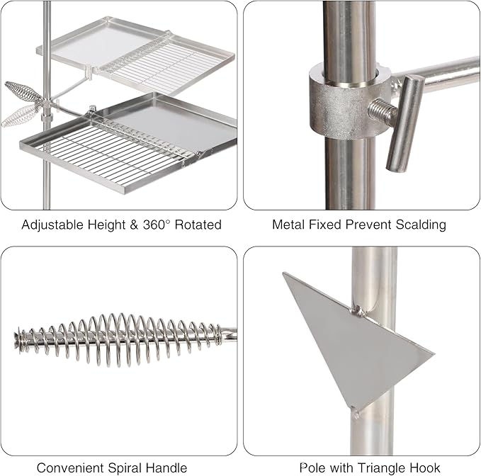- Adjustable Grill Grate: The height of fire pit grill grate is adjustable to meet different demands. It’s 360° rotated to heat food more evenly. There’ re 2 fix rings to fix the position.