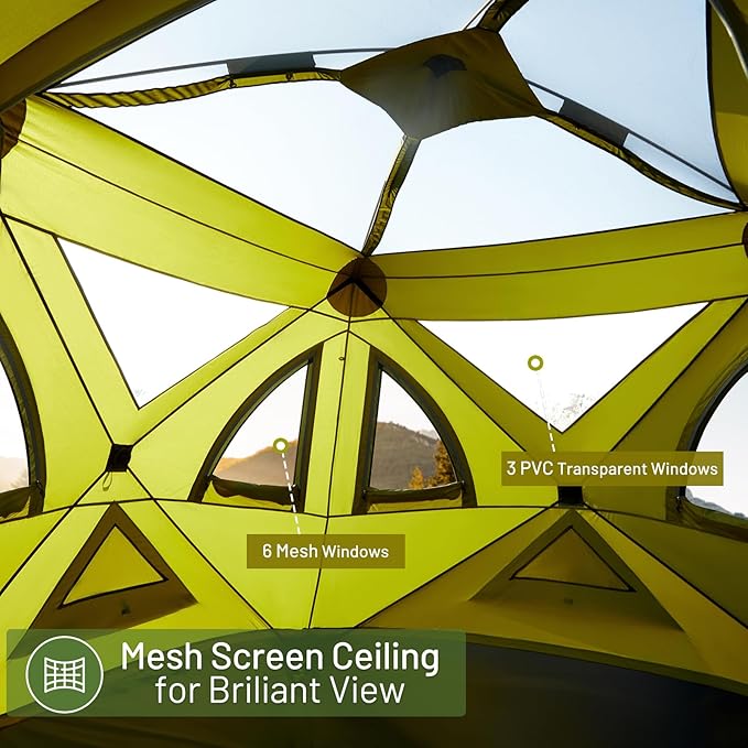 - EXCELLENT VENTILATION: Top Mesh Skylight, 3 PVC transparent windows and 6 mesh windows provide optimal ventilation and visibility, so you can easily stargaze from your instant camping tent at night.Adjustable air vents draw cool air in from the ground and hot air out through the mesh ceiling.