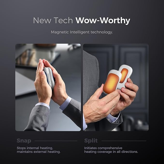 - Magnetic Intelligent technology: True double-sided Heating hand warmers is coming! Upon snapping, the external side continues to heat while the internal heating is paused. When separated, both sides of each one activate heating, providing all-around warmth.