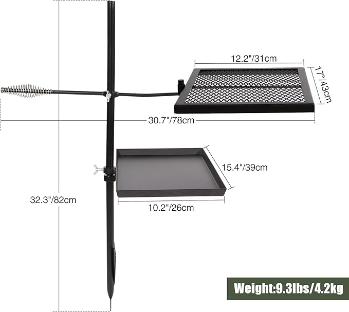 - Dimensions: The height of the campfire swivel grill is 32.3’’/82cm. The size of the grill grate is 17x12.2’’/43x31cm. The size of the grill pan is 15.4x10.2’’/39x26cm. The weight is 9.3lbs/4.2kg. It’s lightweight and compact, easy to carry with storage bag.