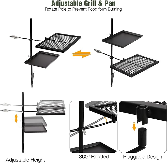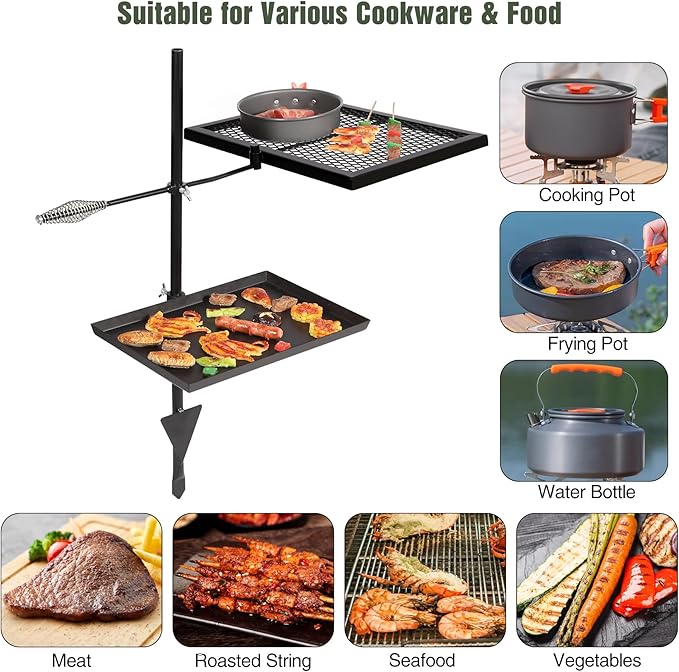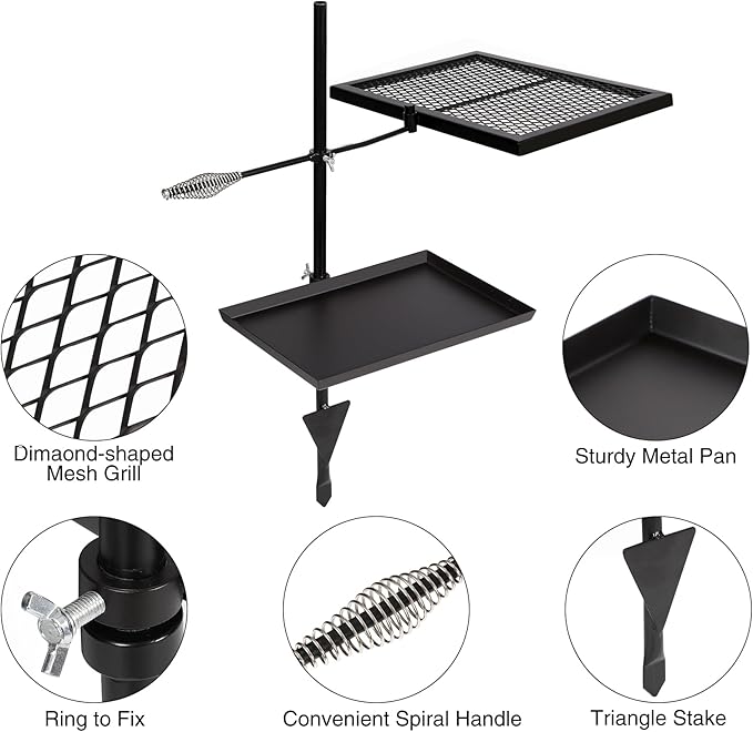 - Premium Material: The swivel campfire grill with grill pan is made of high quality iron material, which is durable and corrosion resistant. It has great fire resistance and hardness.