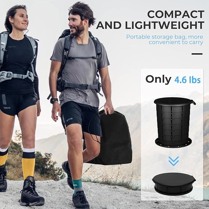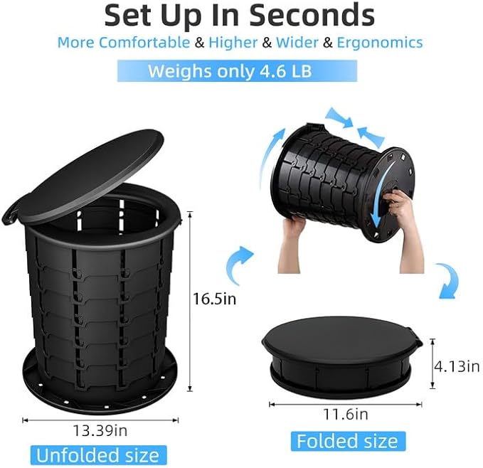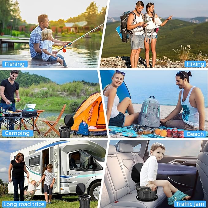 - MULTI-FUNCTIONAL: Multi-Functions design, makes you free to switch various modes of use, very practical. It can not only be used as an camping toilet, but also as a trash can, a stool, a storage box, a vomiting bucket, etc. To satisfy your different needs when taking outdoor activities. Perfect for camping, hiking, backpacking, beach, fishing, boating, marine, traveling, traffic jam, hunting, outdoor living, trips, construction site, long road trips and anywhere emergencies, etc