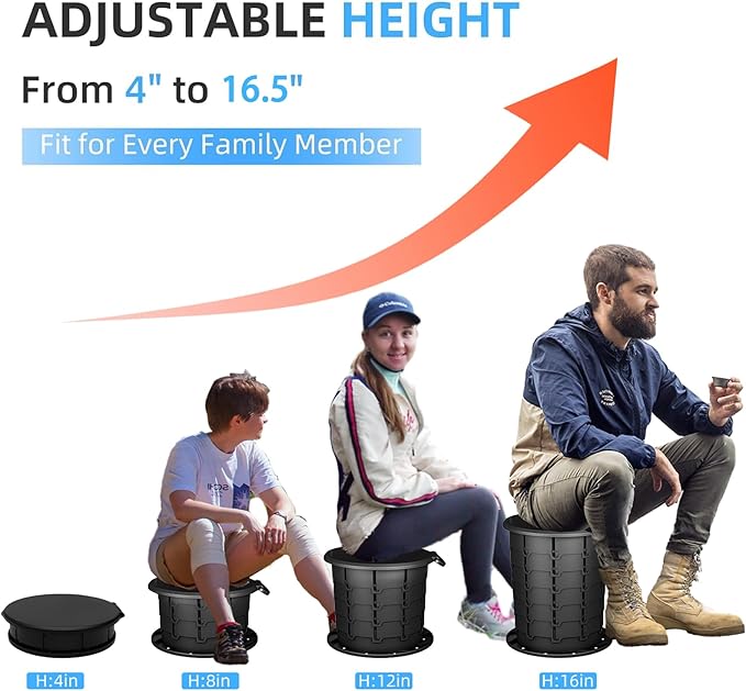 - UPGRADE HEIGHTENING PORTABLE TOILET: Our camping toilets portable is 16.5 inches high. It stands out as one of the tallest size in its category. For adults who are 5.6 feet tall or taller, the knee comfort will be enhanced. Additionally, we have widened the seat cover of this camper toilet. Higher size brings a more relaxed experience