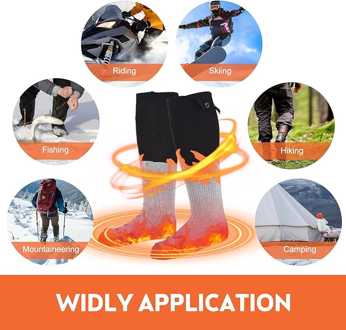 - 🔥【Wide Application Winter Socks】Battery heated socks are more than just socks, they are your ideal companion for winter sports and outdoor activities. Heated socks are ideal for many indoor and outdoor activities in winter. heated socks also make a great gift for your loved ones, ensuring they stay warm and cozy during winter activities.
